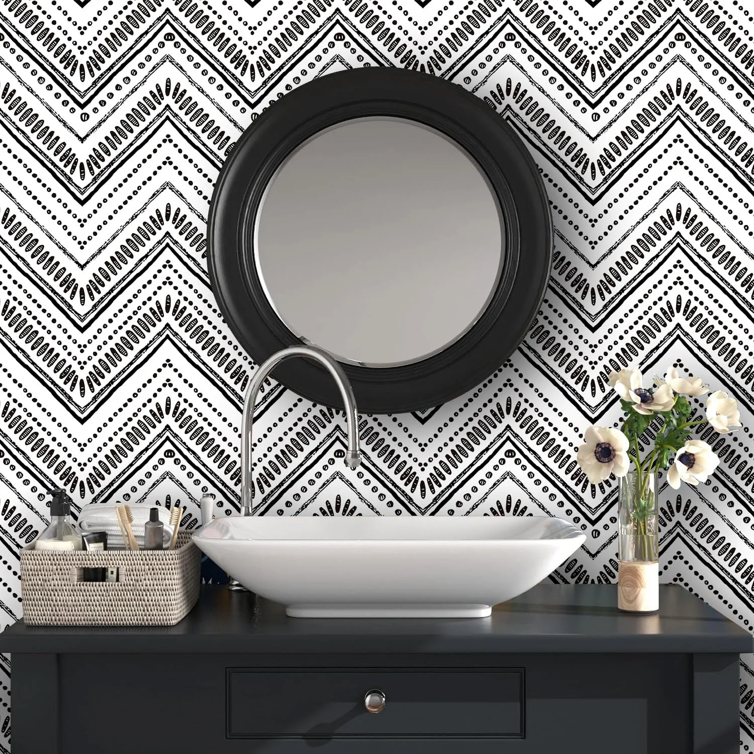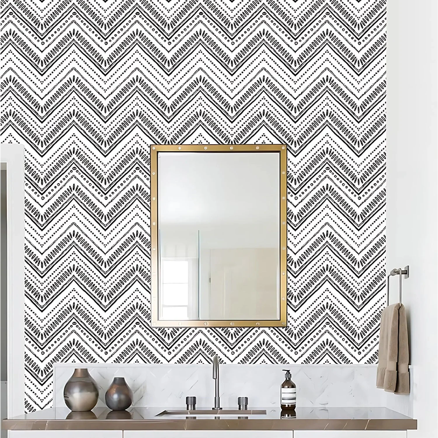 Modern Chevron Pattern: Stylish black-and-white geometric design that adds a contemporary touch to any room.
