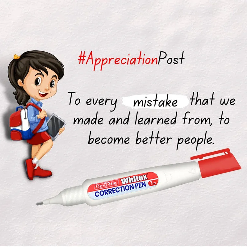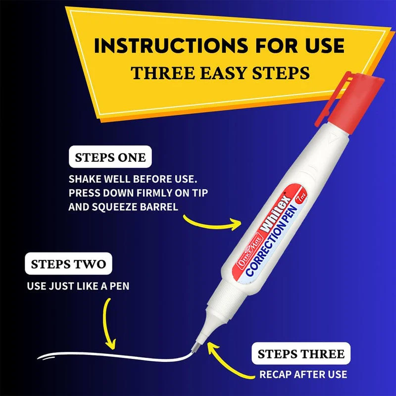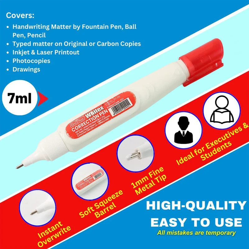 This white correction pen offers a clean and precise way to correct handwritten or printed text instantly. With a 1mm fine metal tip, it allows smooth and accurate application, making it ideal for neat corrections on documents, drawings, and notes. The quick-drying formula ensures fast coverage without smudging, so you can overwrite immediately. Its soft-squeeze barrel design gives easy flow control for effortless use. Perfect for students, teachers, and office professionals, this 7ml correction pen is reliable, easy to handle, and ensures spotless results every time.