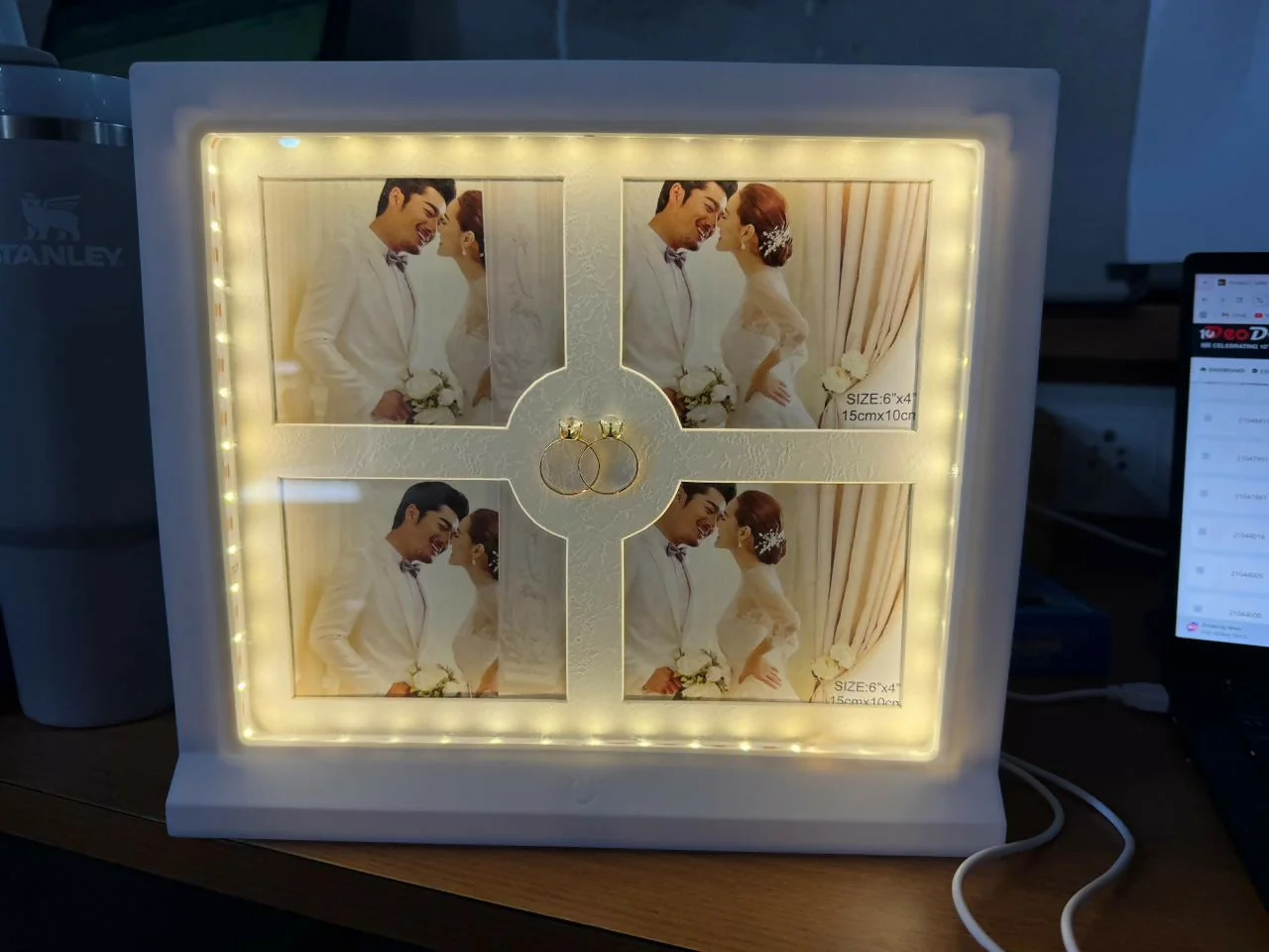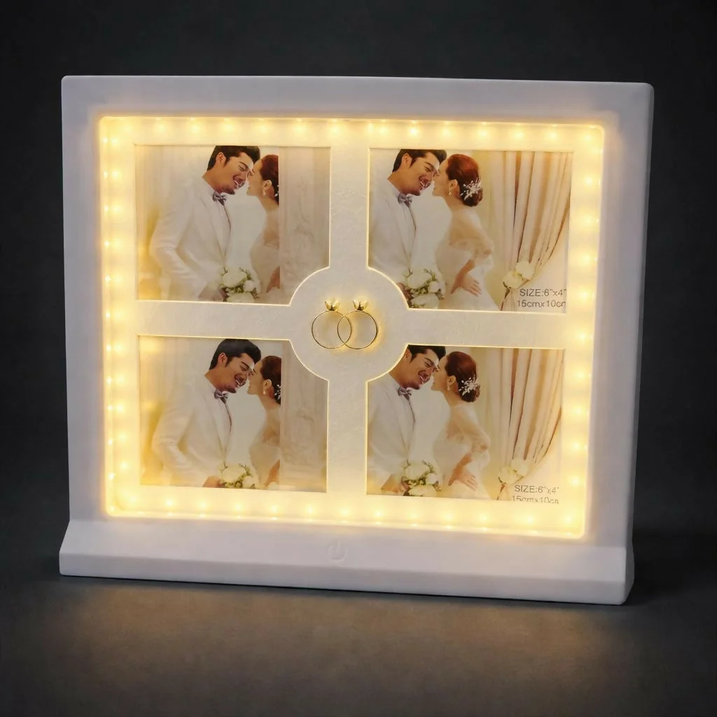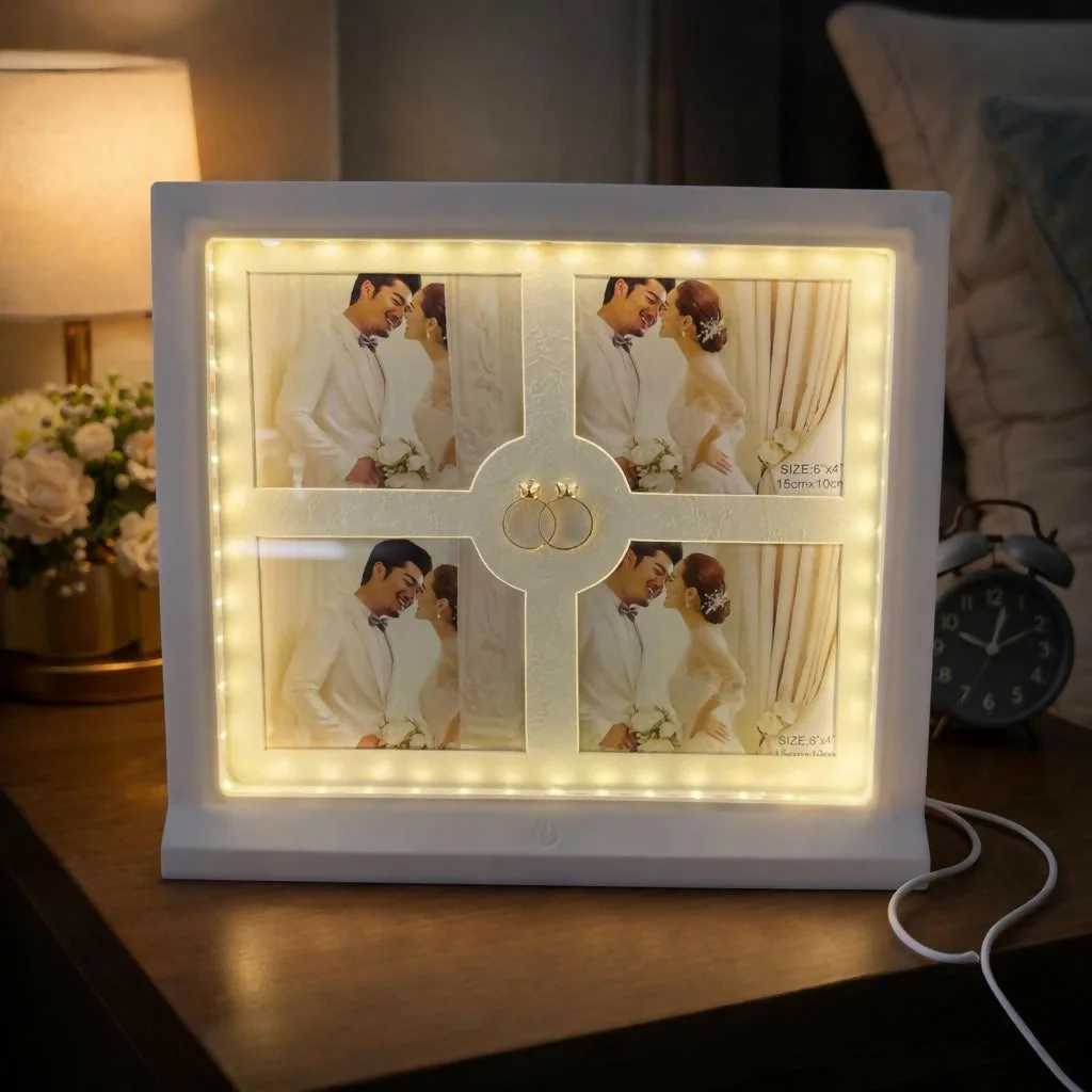 led photo frame, collage photo frame, 4 photo frame, decorative frame, couple photo frame, wedding gift frame, anniversary gift, glowing photo frame, home decor frame, table decor item, memory frame, led frame decor, photo collage frame, gift for couple, bedroom decor