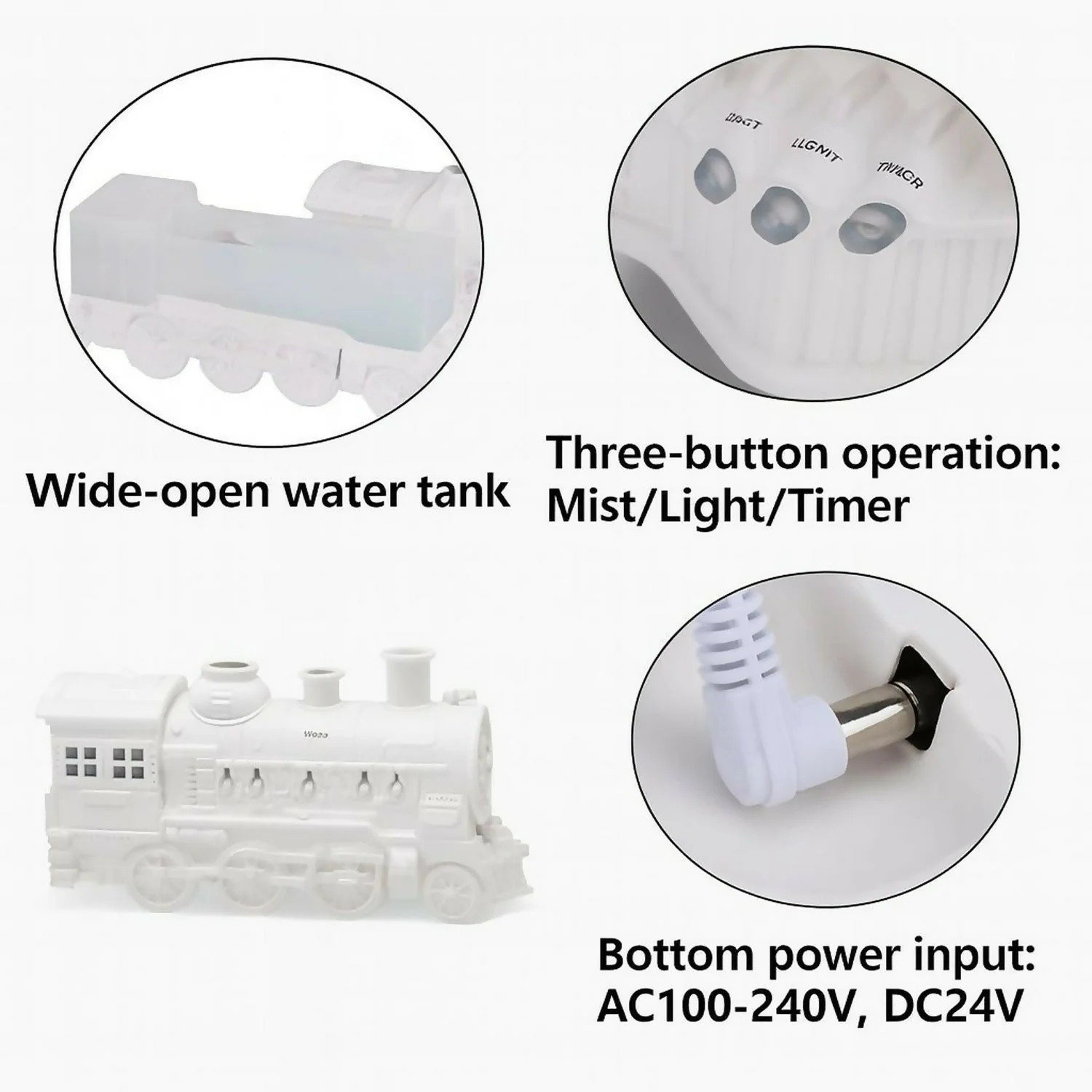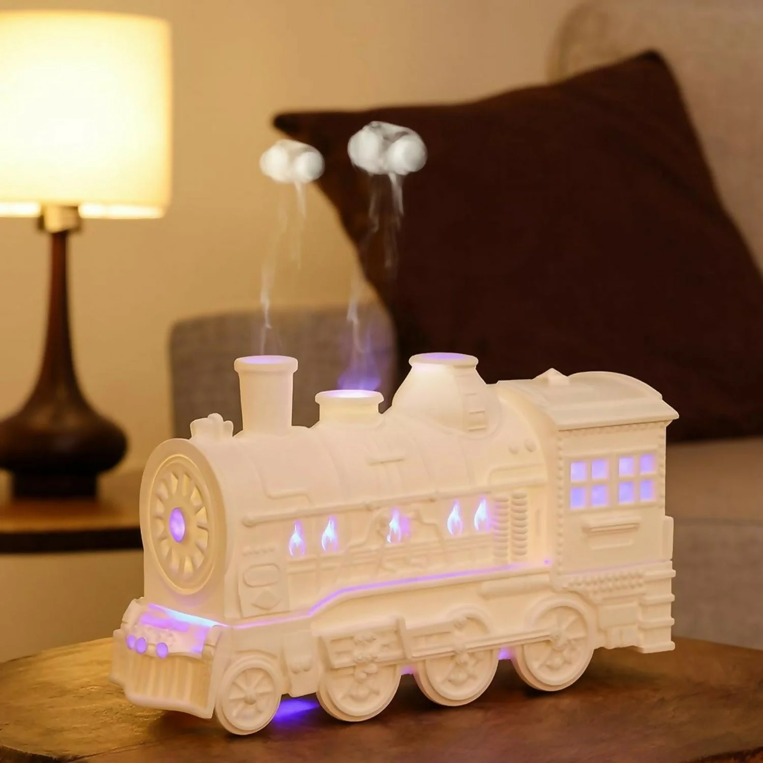 white train diffuser, train humidifier, double spray aroma diffuser, locomotive humidifier, LED flame diffuser, ultrasonic aroma machine, home décor diffuser, kids room humidifier, creative aromatherapy diffuser, essential oil diffuser train, steam train humidifier, gift humidifier