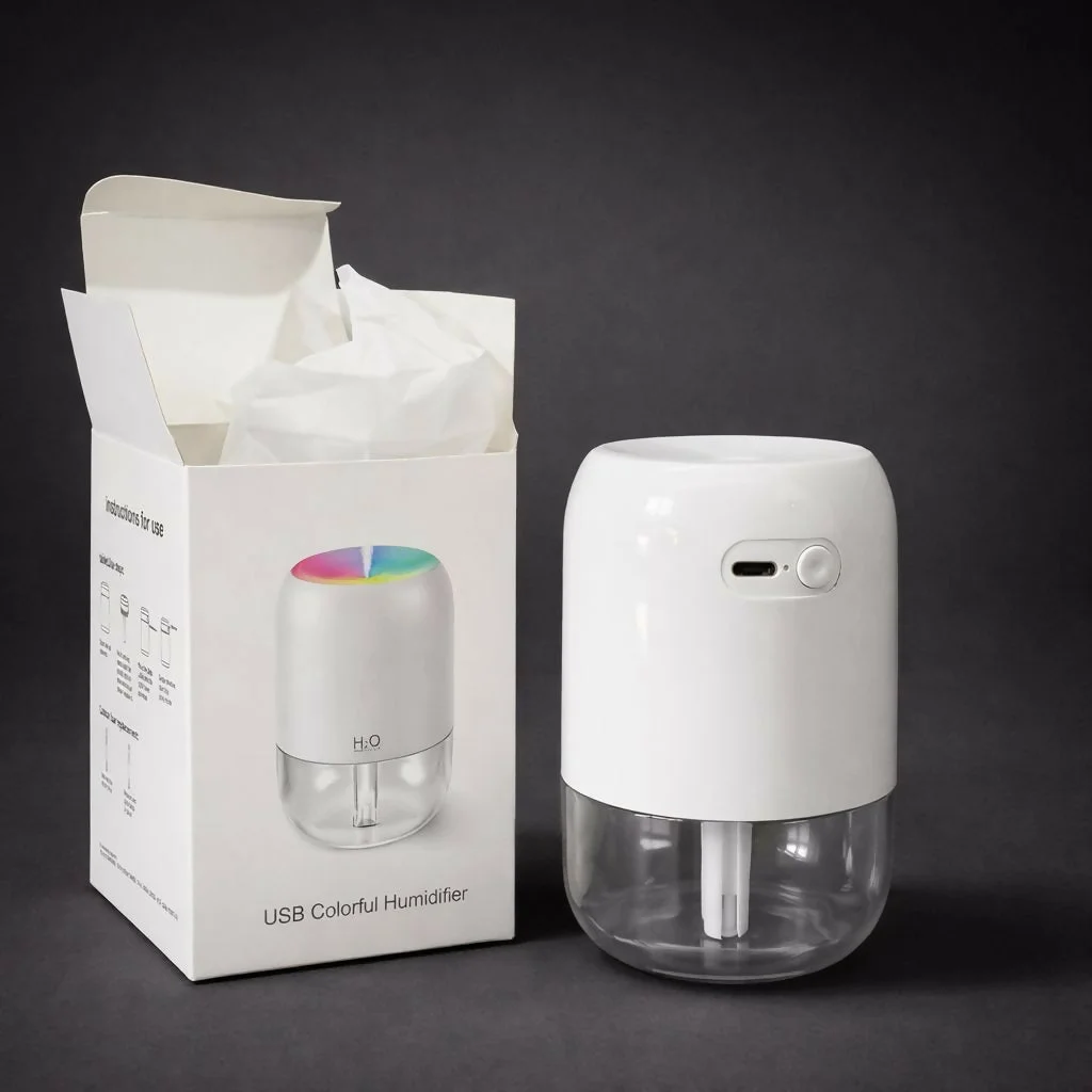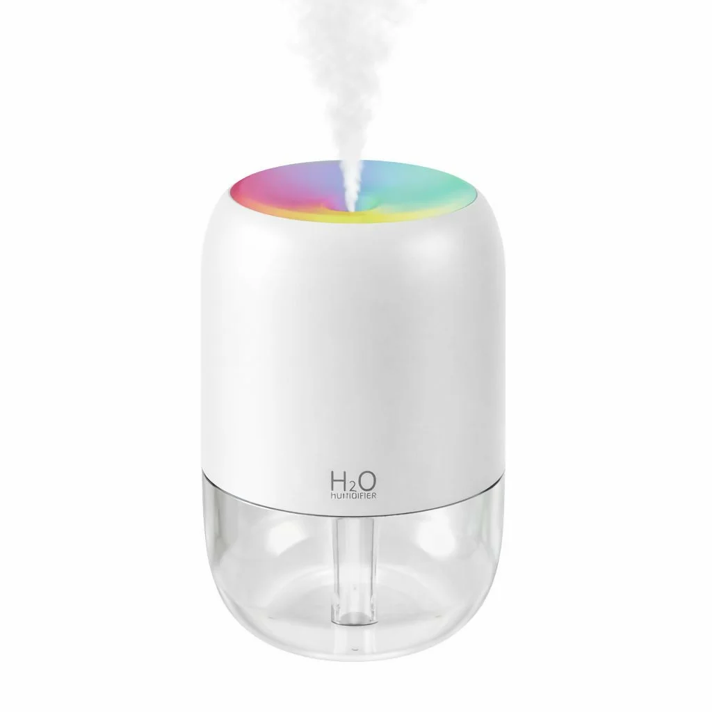 Keep your space fresh and comfortable with this compact H2O mini humidifier designed for modern homes and workspaces. Featuring a sleek cylindrical design with a transparent water tank, it releases a fine mist that helps maintain healthy air moisture levels. The built-in multicolor LED light creates a relaxing ambiance, making it perfect for bedrooms, offices, and study desks. Powered through USB, the humidifier is easy to use with laptops, power banks, or adapters. Its quiet operation and stylish look make it both a functional air humidifier and a decorative accessory for small rooms.
