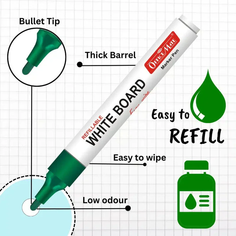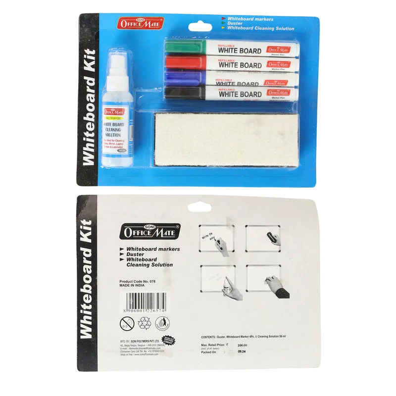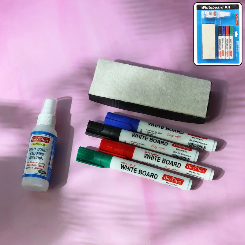 This whiteboard starter kit is the perfect all-in-one solution for classrooms, offices, and home learning spaces. The set includes four refillable markers in vibrant colors — red, blue, green, and black — for clear and bold writing. A high-quality duster ensures quick and clean erasing without leaving residue, while the 50ml cleaning solution keeps your board spotless and shining after every use. The markers deliver smooth ink flow with a quick-drying formula to prevent smudging, making your writing sharp and visible. Ideal for teachers, professionals, and students, this kit offers everything you need for an efficient and organized writing experience.
