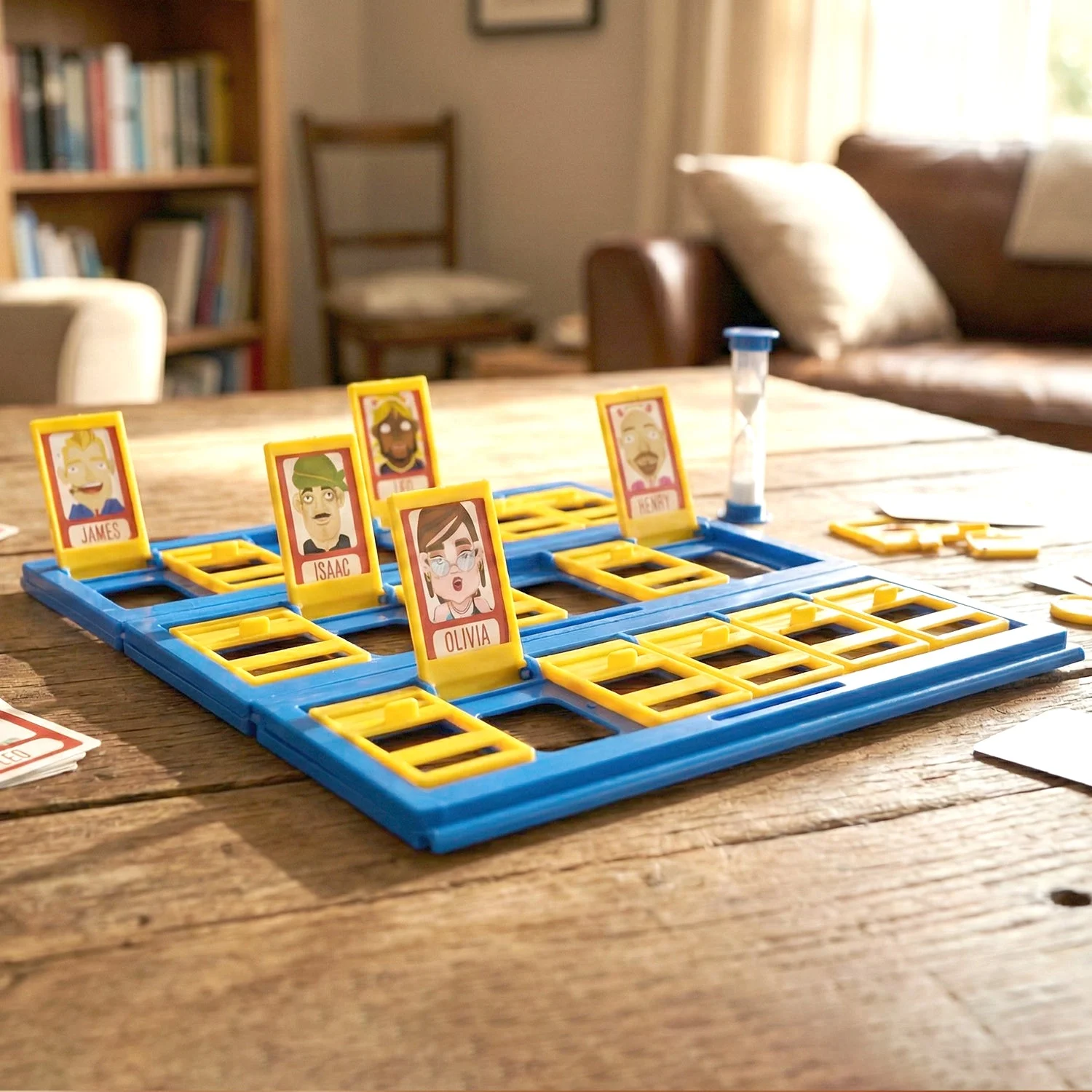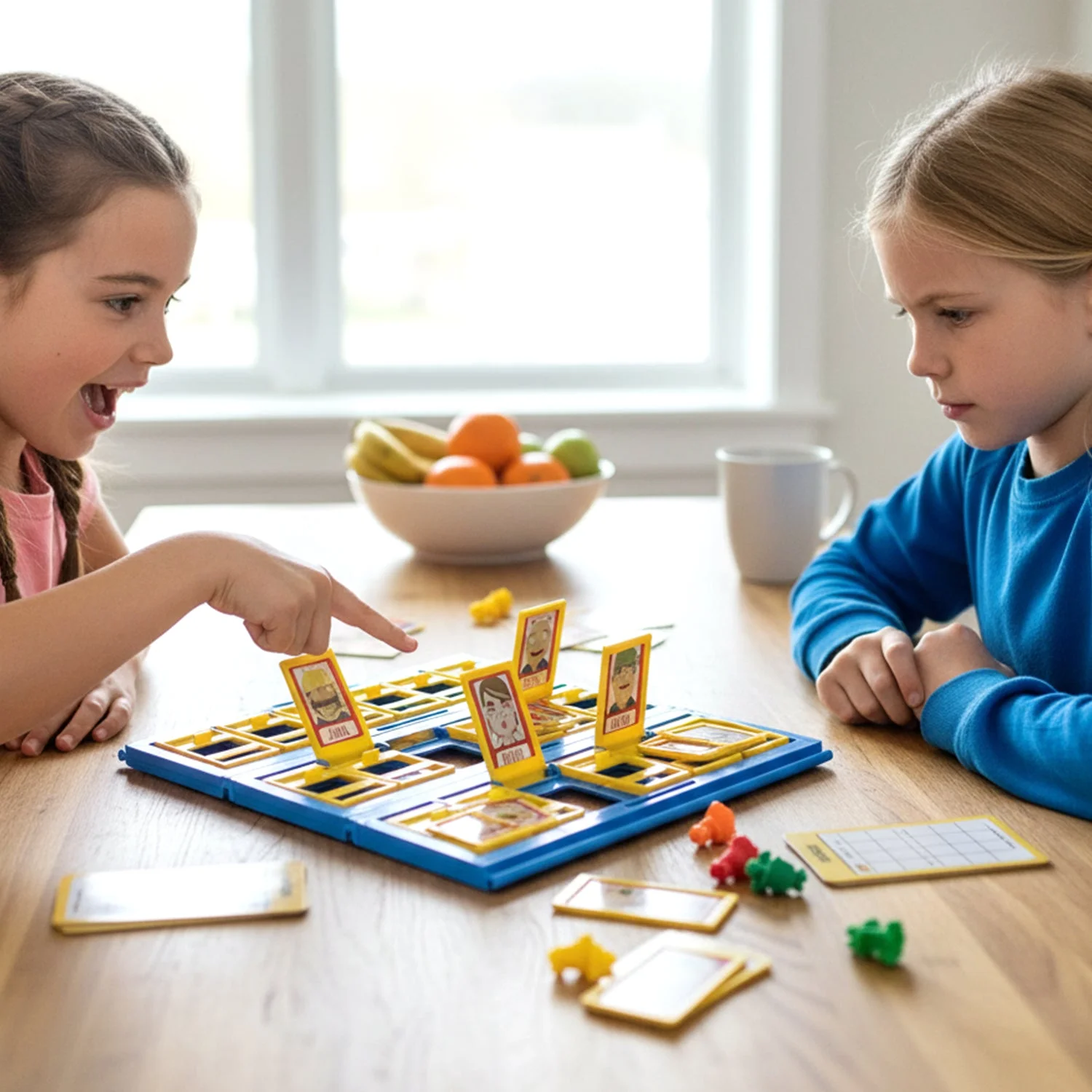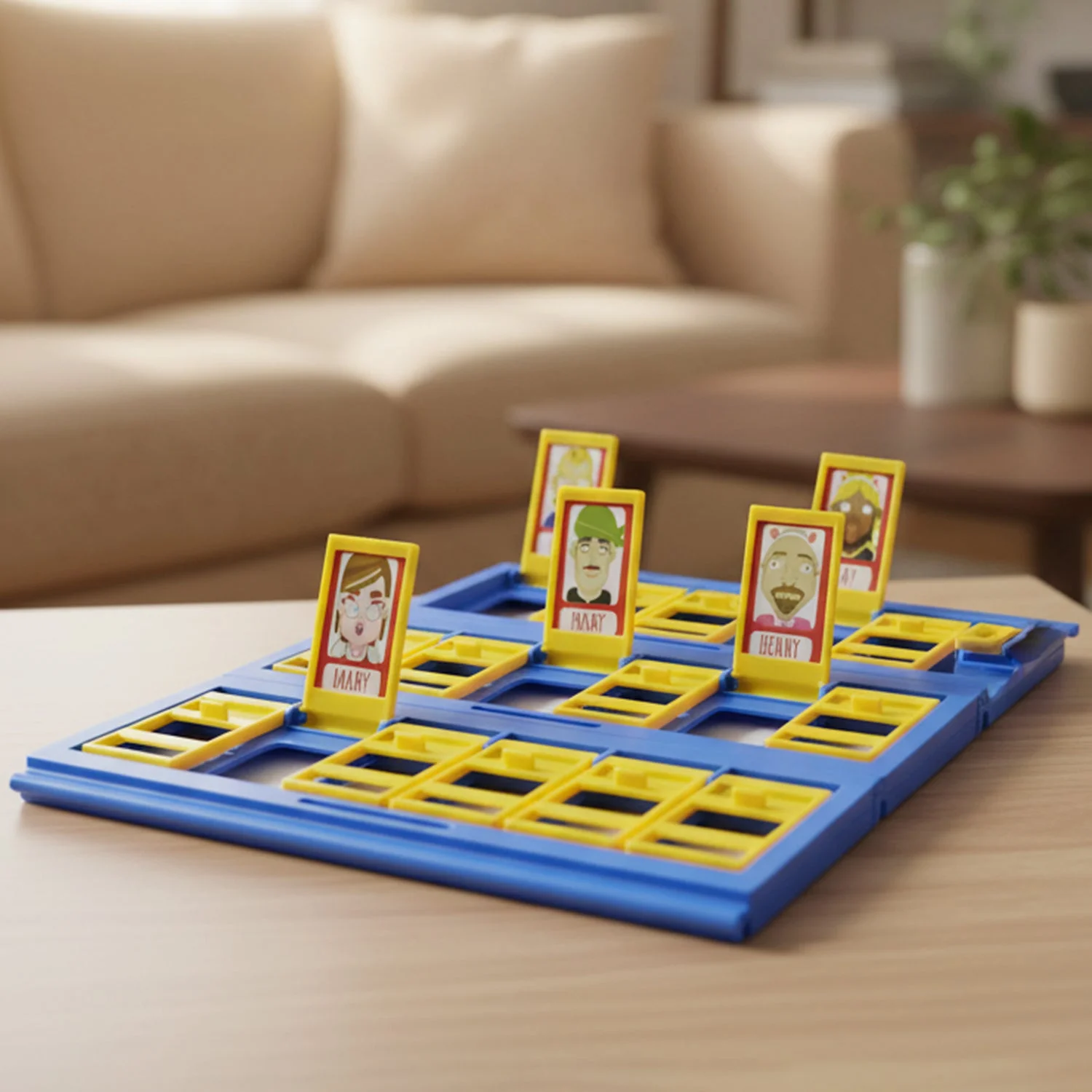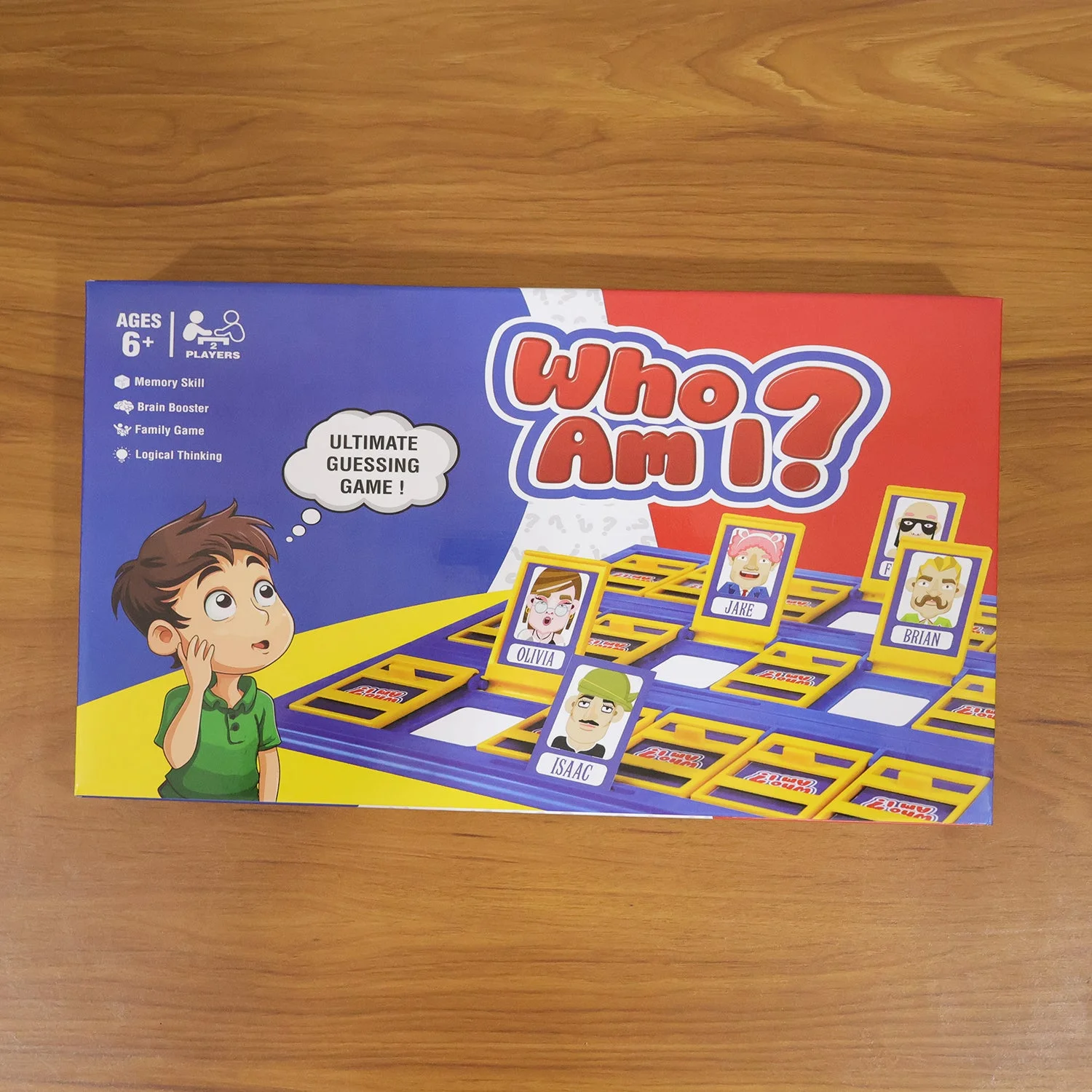Who Am I? guessing board game, kids interactive board game, family indoor game, 2 player guessing game, character flip card game, brain development game for children, fun learning activity, party night game, travel friendly board game, friends game for kids, educational board game, children’s interactive game, memory and logic game, group play board game