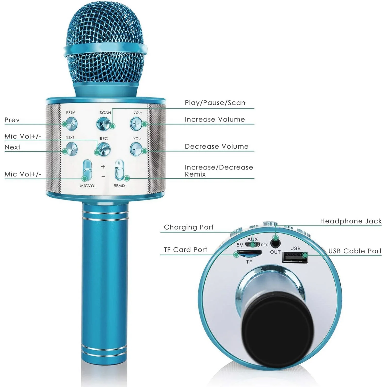 - Bluetooth Mic Speaker: The microphone is a great size and fits snugly in the hand. The sound is nice, clean, you can pretty much use it to sing, talk and even play music.