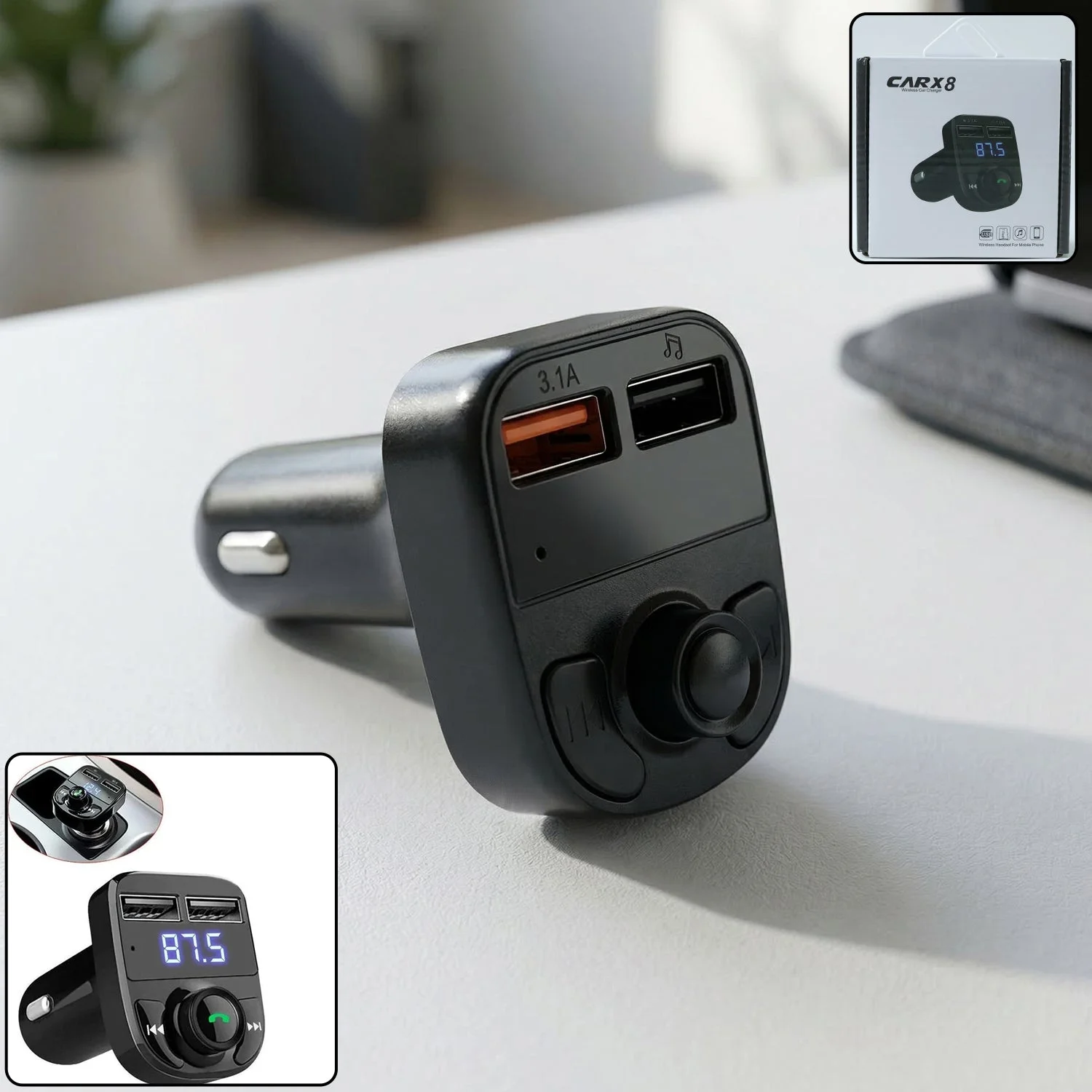 Wireless Car Charger with Dual USB Fast Charging Ports 1 Pc – Handsfree Calling Music Player with LED Display and Multi-Function Control Knob