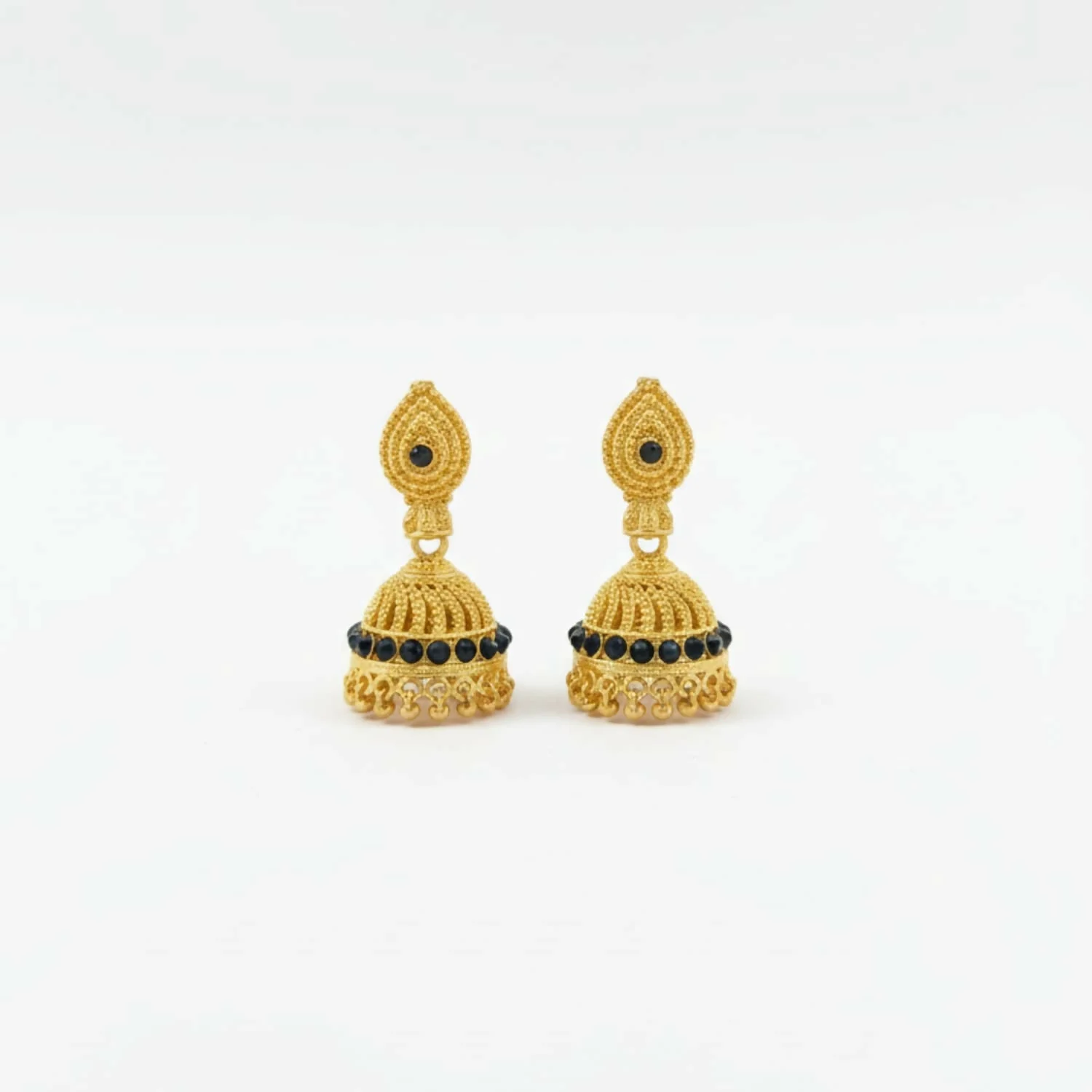 Elevate your ethnic wardrobe with these exquisitely crafted Gold-Plated Jhumka Earrings, featuring intricate filigree work and a classic bell-shaped drop. The ornate circular studs are accented with vibrant green and blue enamel touches, adding a regal pop of color to the traditional design. Finished with delicate golden beads that offer a graceful sway, these lightweight yet stunning earrings are the perfect statement piece for weddings, festivals, and special celebrations.
