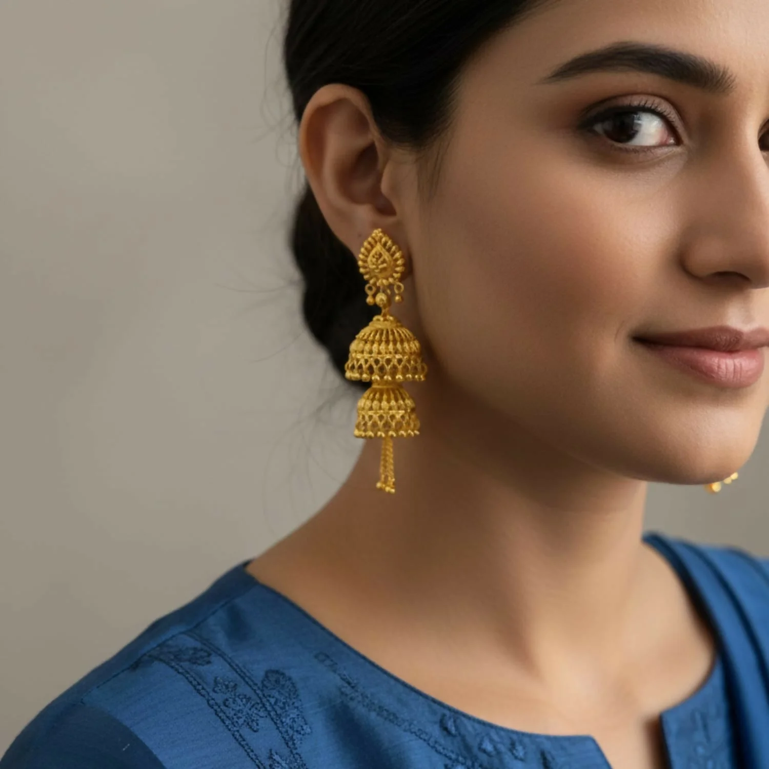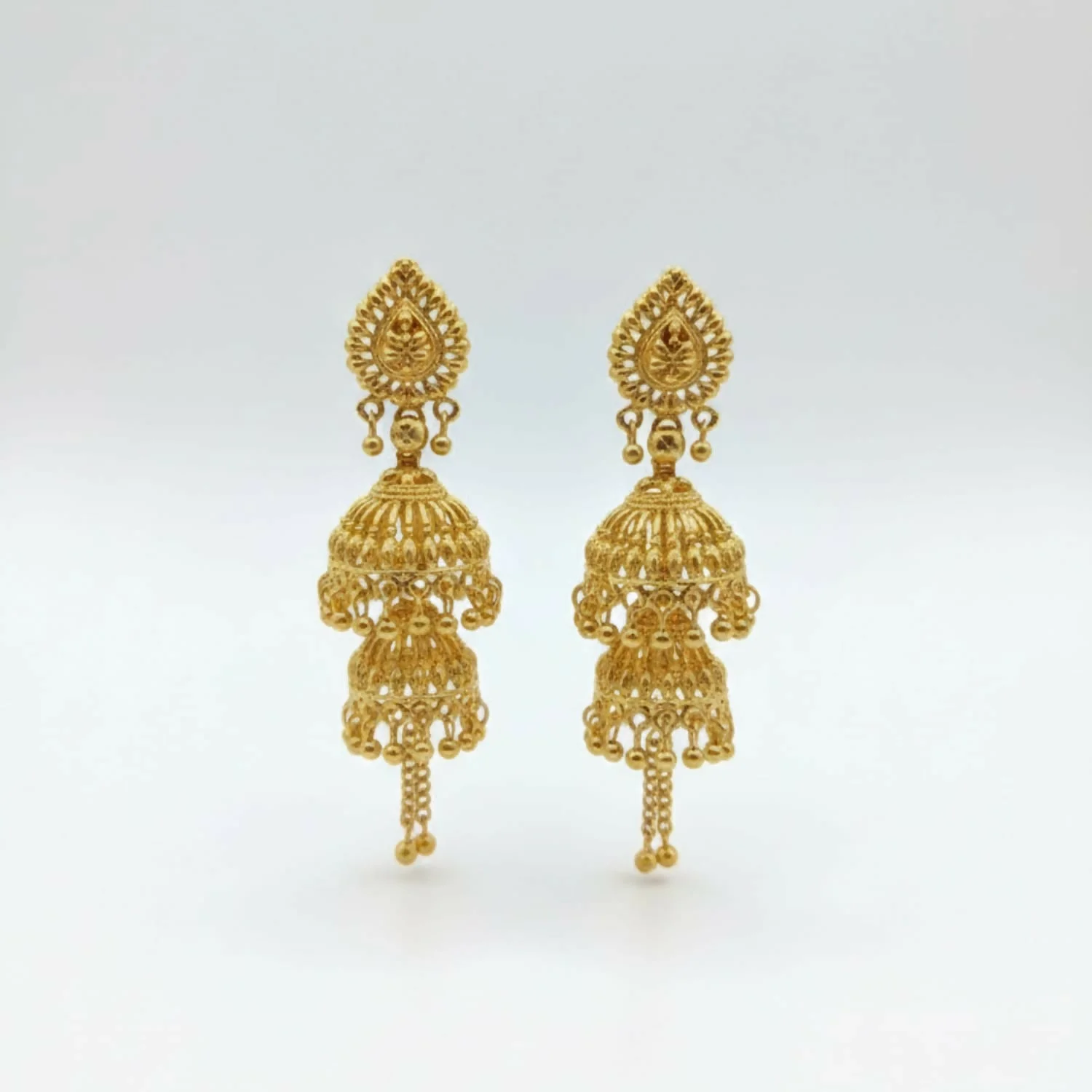 Elevate your ethnic wardrobe with these exquisitely crafted Gold-Plated Jhumka Earrings, featuring intricate filigree work and a classic bell-shaped drop. The ornate circular studs are accented with vibrant green and blue enamel touches, adding a regal pop of color to the traditional design. Finished with delicate golden beads that offer a graceful sway, these lightweight yet stunning earrings are the perfect statement piece for weddings, festivals, and special celebrations.