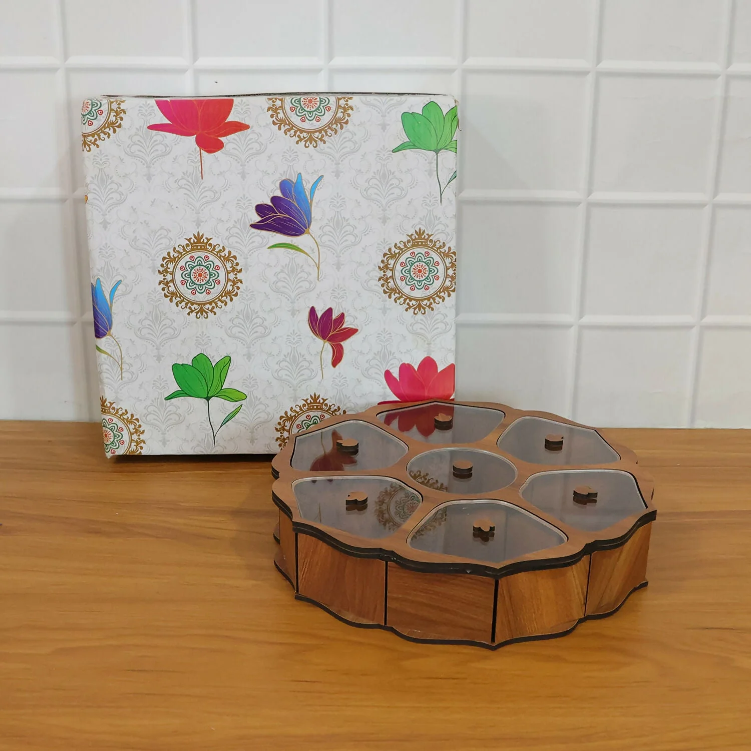 Upgrade your serving and storage style with this elegant wooden dry fruit storage box featuring 7 spacious compartments and transparent lids. Designed in a beautiful floral shape, this multipurpose organizer keeps almonds, cashews, pistachios, walnuts, raisins, and other snacks neatly arranged and easily accessible. The clear lids with easy-grip knobs help maintain freshness while allowing quick visibility of contents. Ideal for festive gifting, family gatherings, and everyday kitchen use, this box combines practicality with decorative appeal. Its sturdy wooden construction enhances durability while adding a premium touch to your dining or coffee table setup.