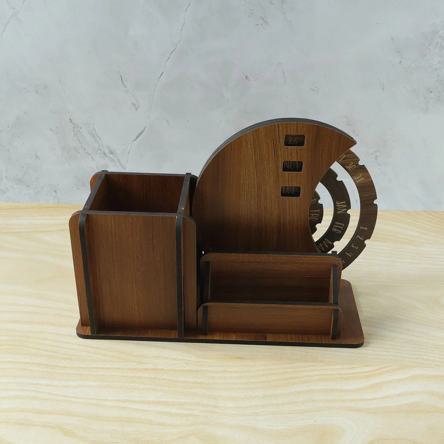 wooden desk organizer, pen stand, business card holder, rotating calendar wheel, multi-compartment desk organizer, office table top stationery storage, home desk organizer, office desk organizer, study desk storage stand, workstation organizer, desktop pen holder, business card storage, rotating calendar desk accessory, multifunctional desk organizer, wooden office organizer, stationery holder for desk
