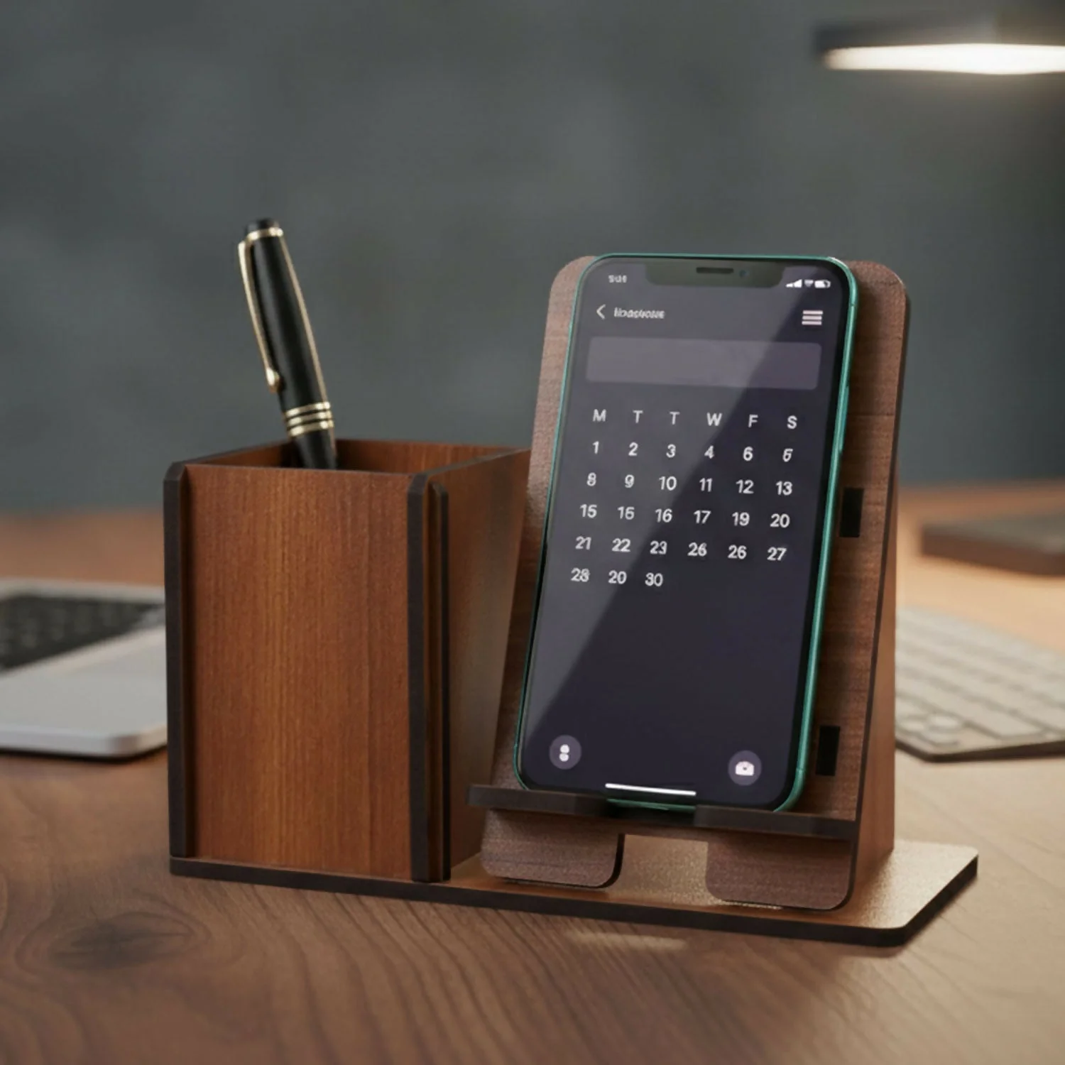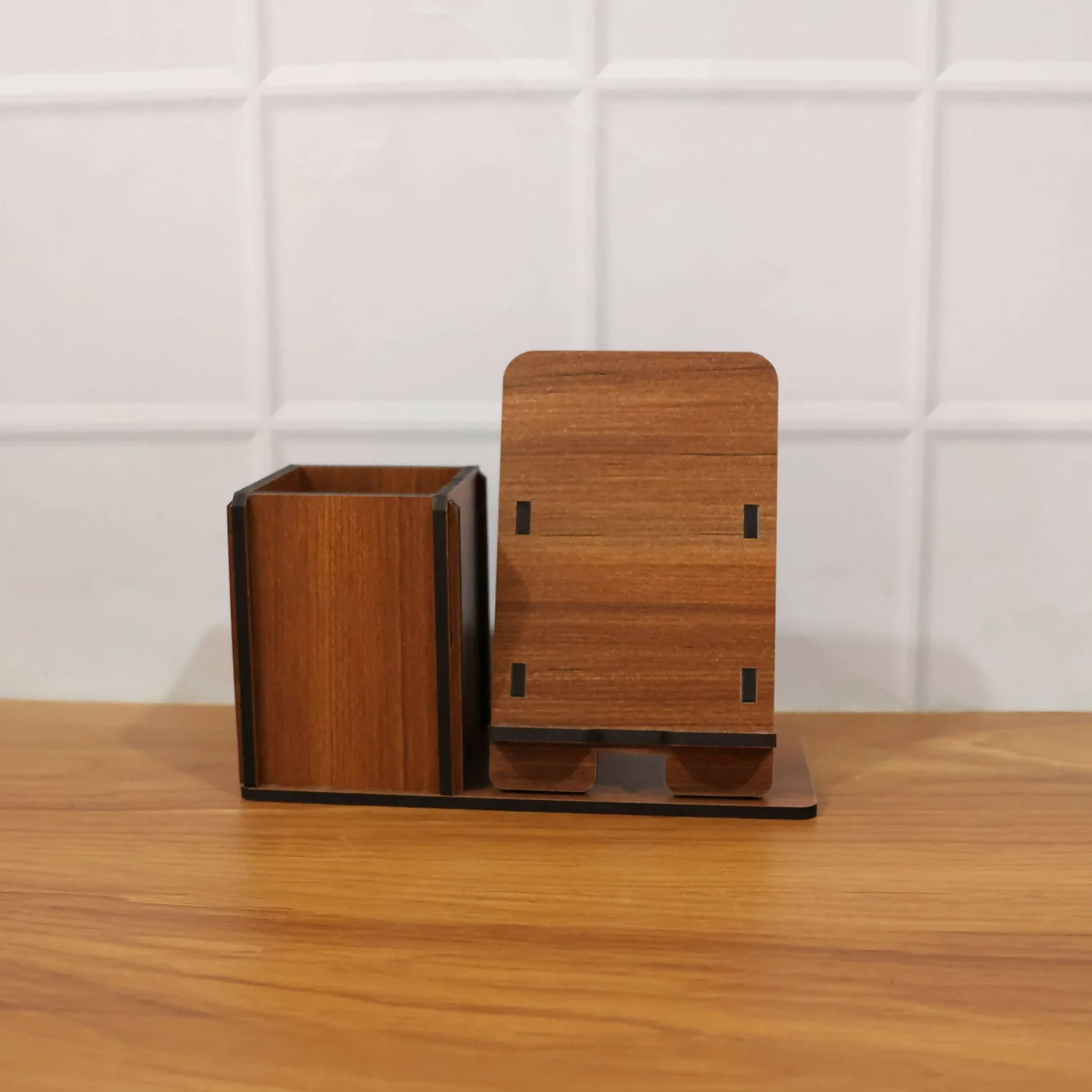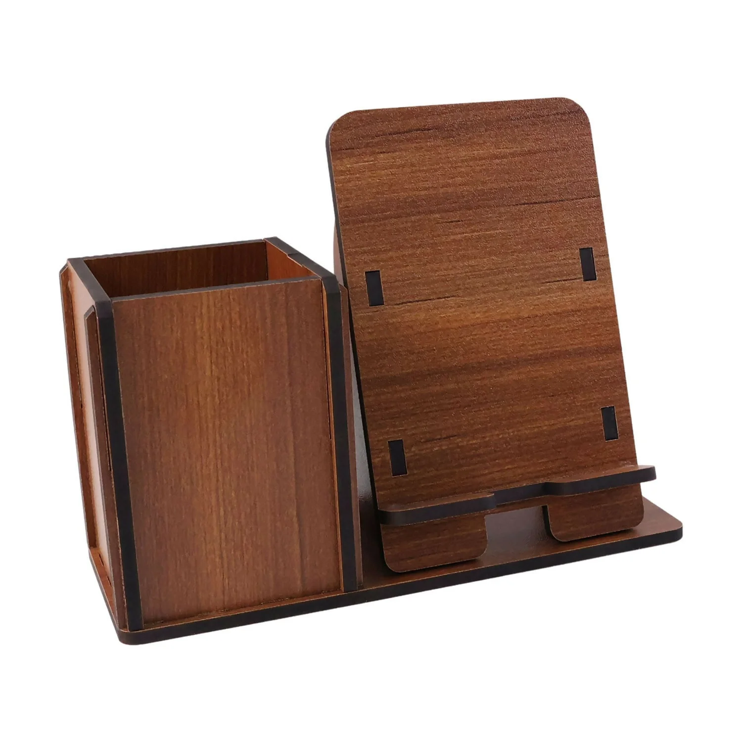 Crafted from high-quality wood with a smooth finish, it includes a spacious storage compartment for pens, stationery, or small accessories, alongside a sturdy angled stand that securely holds your smartphone or tablet for easy viewing. The minimalist design makes it perfect for home offices, workstations, study desks, or bedside tables.