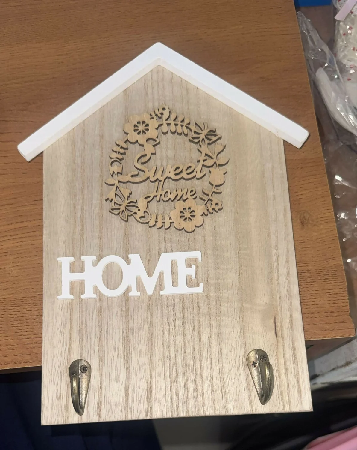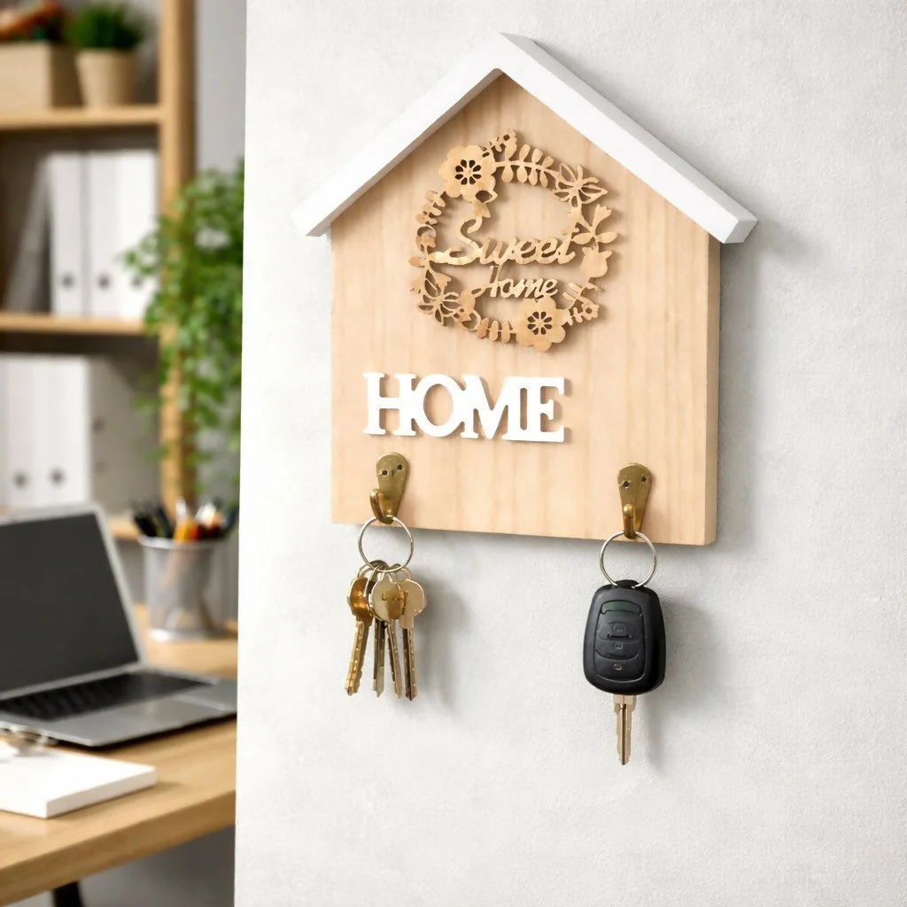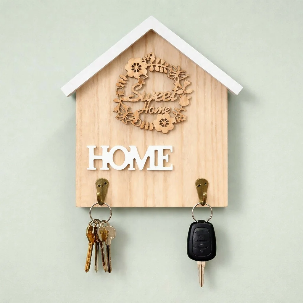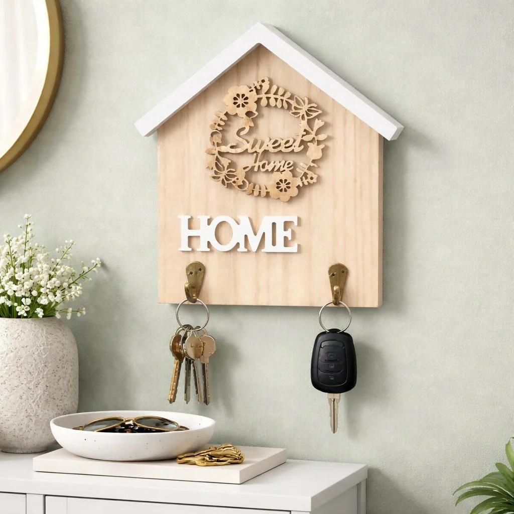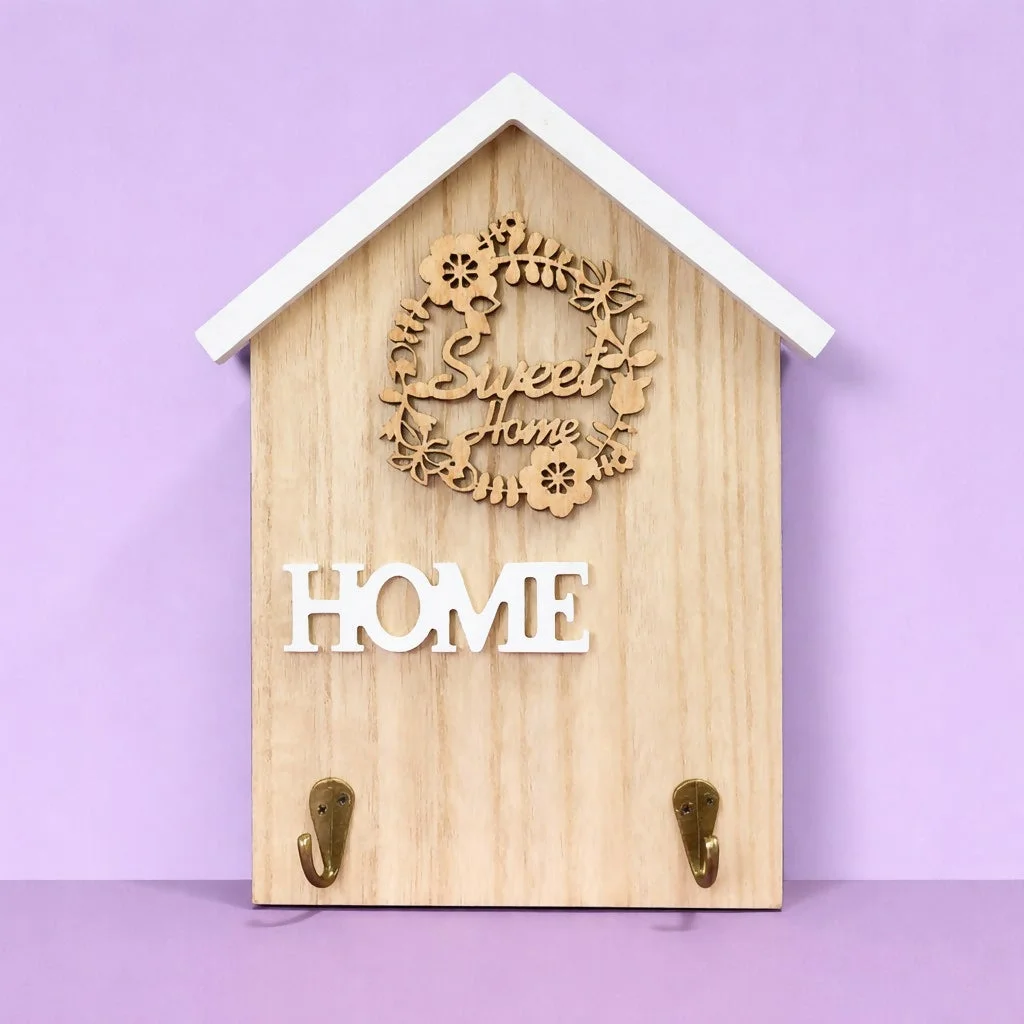 Keep your essentials organized with this elegant wooden home-shaped key holder. Designed with a beautiful “Sweet Home” decorative element and a minimal aesthetic, it adds warmth and charm to your living space. The 2 sturdy hooks provide a convenient place to hang keys, keychains, and small accessories, making it perfect for everyday use. Ideal for entryways, offices, or bedrooms, this wall-mounted organizer blends functionality with stylish decor.