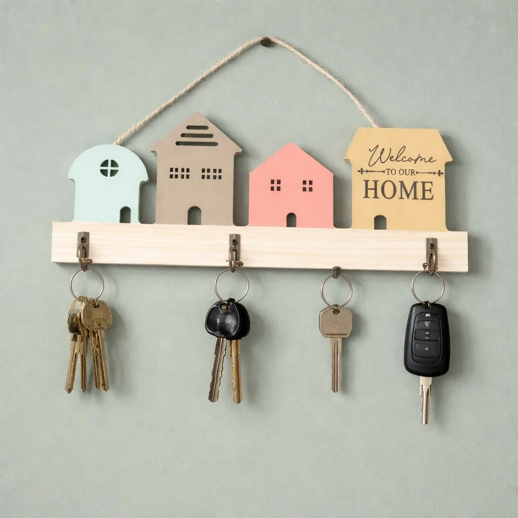 Enhance your home organization with this charming wooden house-themed key holder. Designed with colorful mini house shapes and a welcoming message, it adds a cozy and decorative touch to your walls. The 3 sturdy hooks provide a convenient space to hang keys, keychains, and small essentials, keeping them organized and easy to find. Ideal for entryways, hallways, or living spaces, this wall-mounted organizer blends functionality with attractive home decor.