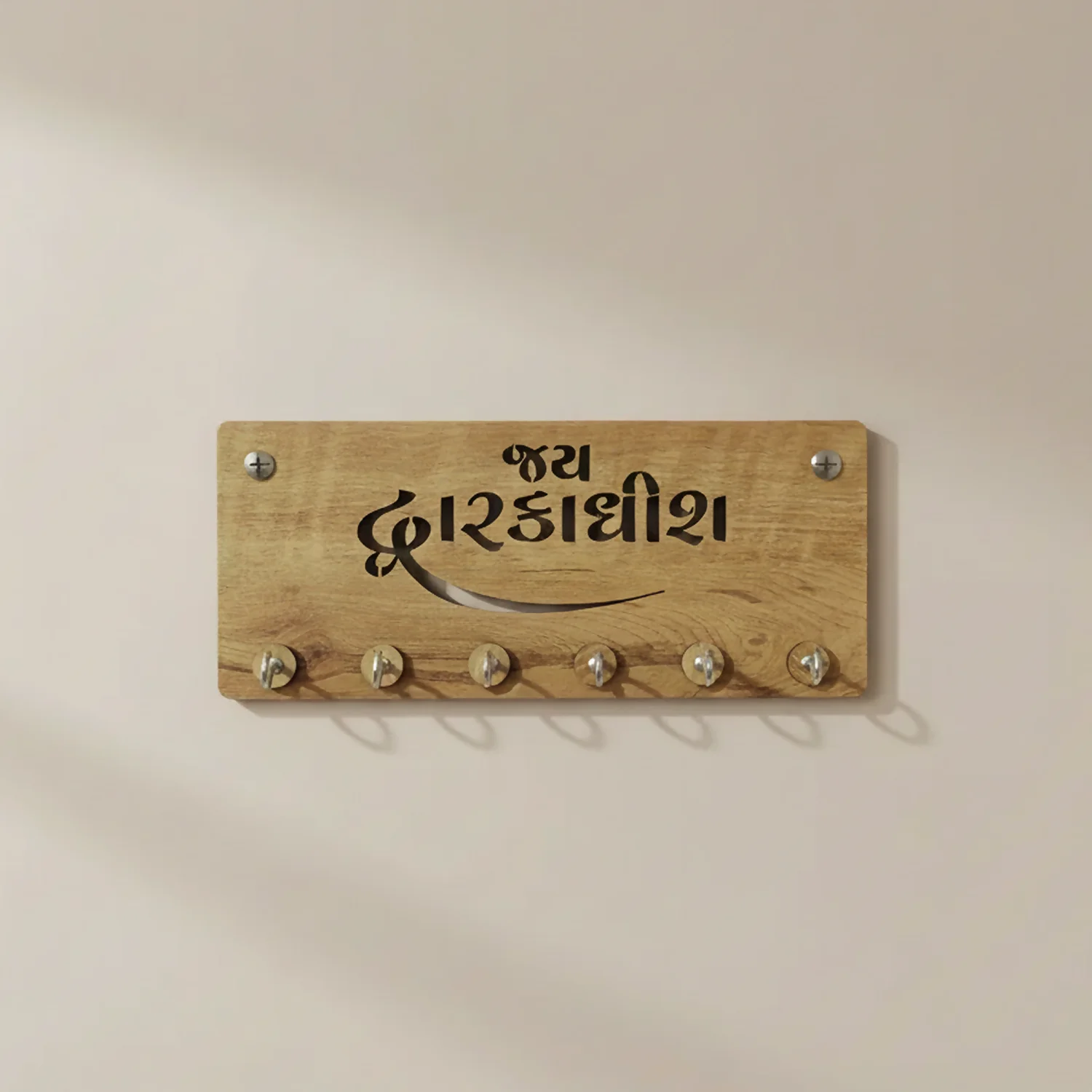 The Gujarati typography engraving adds a traditional and auspicious touch, making it ideal for Indian homes, pooja rooms, entryways, or living spaces. Designed with 6 strong metal hooks, it securely holds house keys, car keys, keychains, and small accessories, keeping them organized and easy to access.