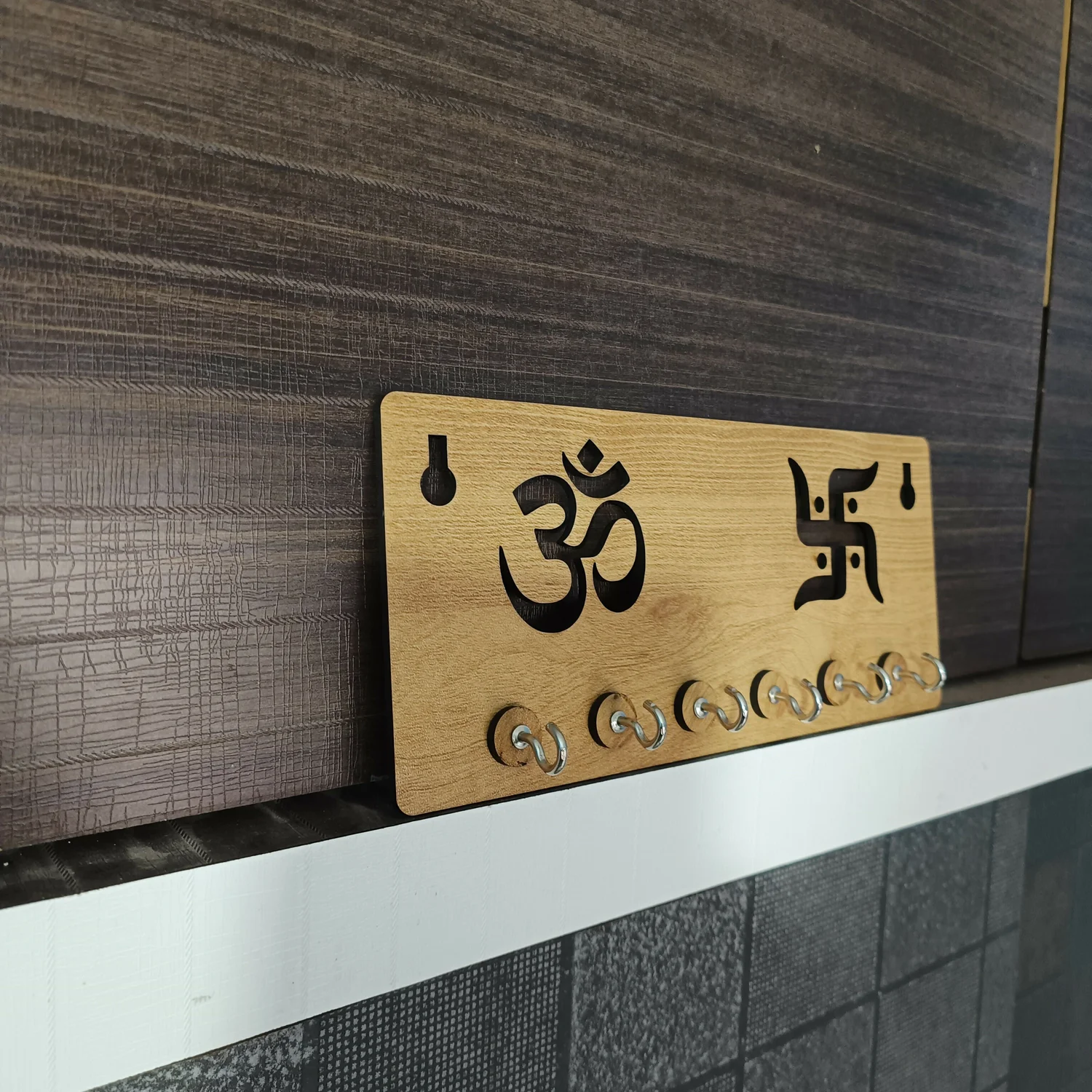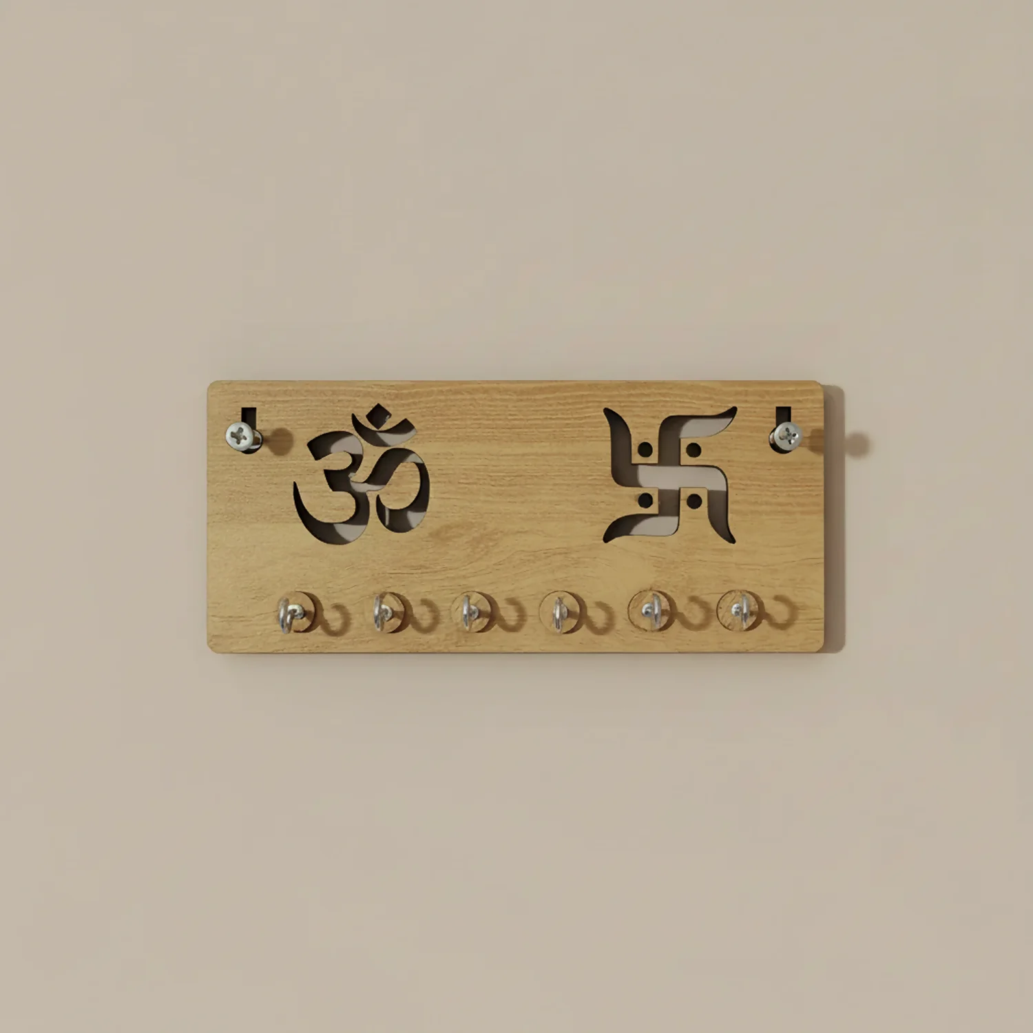The laser-cut Om and Swastik design represents peace, prosperity, and auspicious beginnings—making it ideal for Indian homes, entryways, pooja rooms, living rooms, and offices. Equipped with 6 strong metal hooks, it securely holds house keys, car keys, keychains, and small accessories, keeping them organized and easy to find.