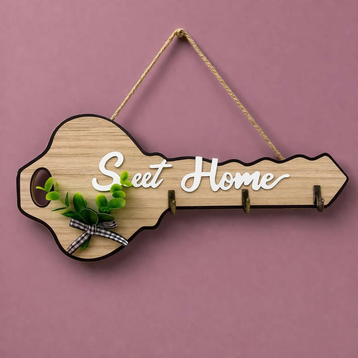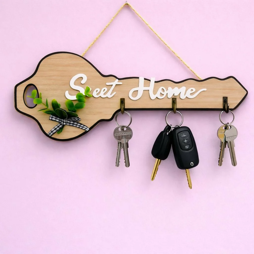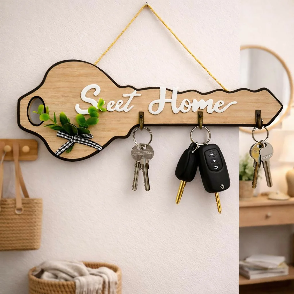 Add a unique and stylish touch to your home with this key-shaped wooden key holder. Featuring a charming “Sweet Home” design with decorative greenery accents, this wall-mounted organizer enhances your decor while keeping your keys neatly arranged. The 4 sturdy hooks provide ample space for keys, keychains, and small accessories, making it perfect for daily use. Ideal for entryways, living rooms, or offices, this functional decor piece combines practicality with modern aesthetics.