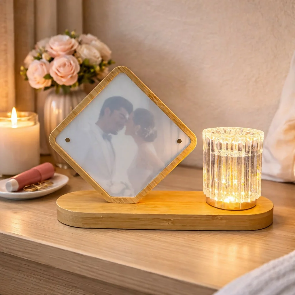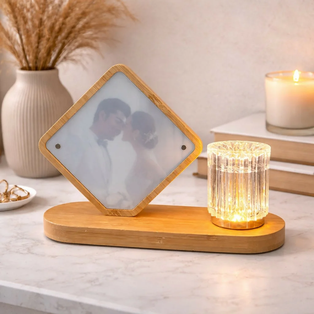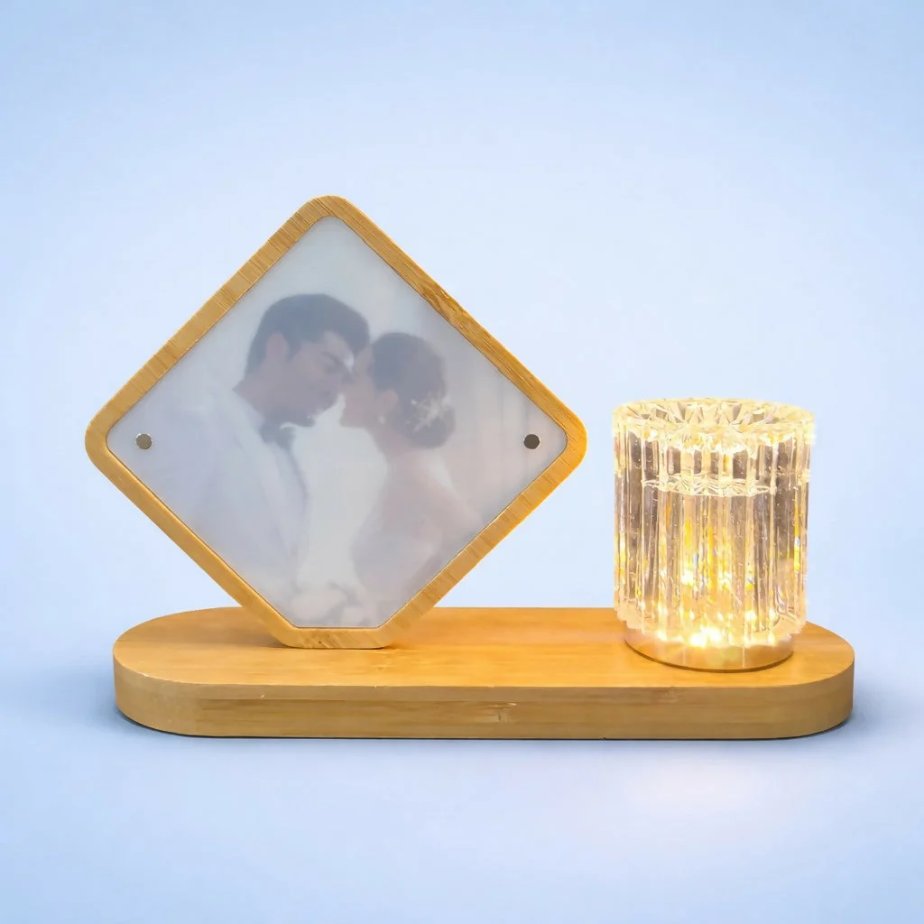 photo frame lamp, wooden LED lamp, bedside decor light, couple photo frame, table lamp decor, ambient light lamp, wooden base lamp, crystal lamp decor, gift for couples, bedroom table lamp, decorative light, modern home decor