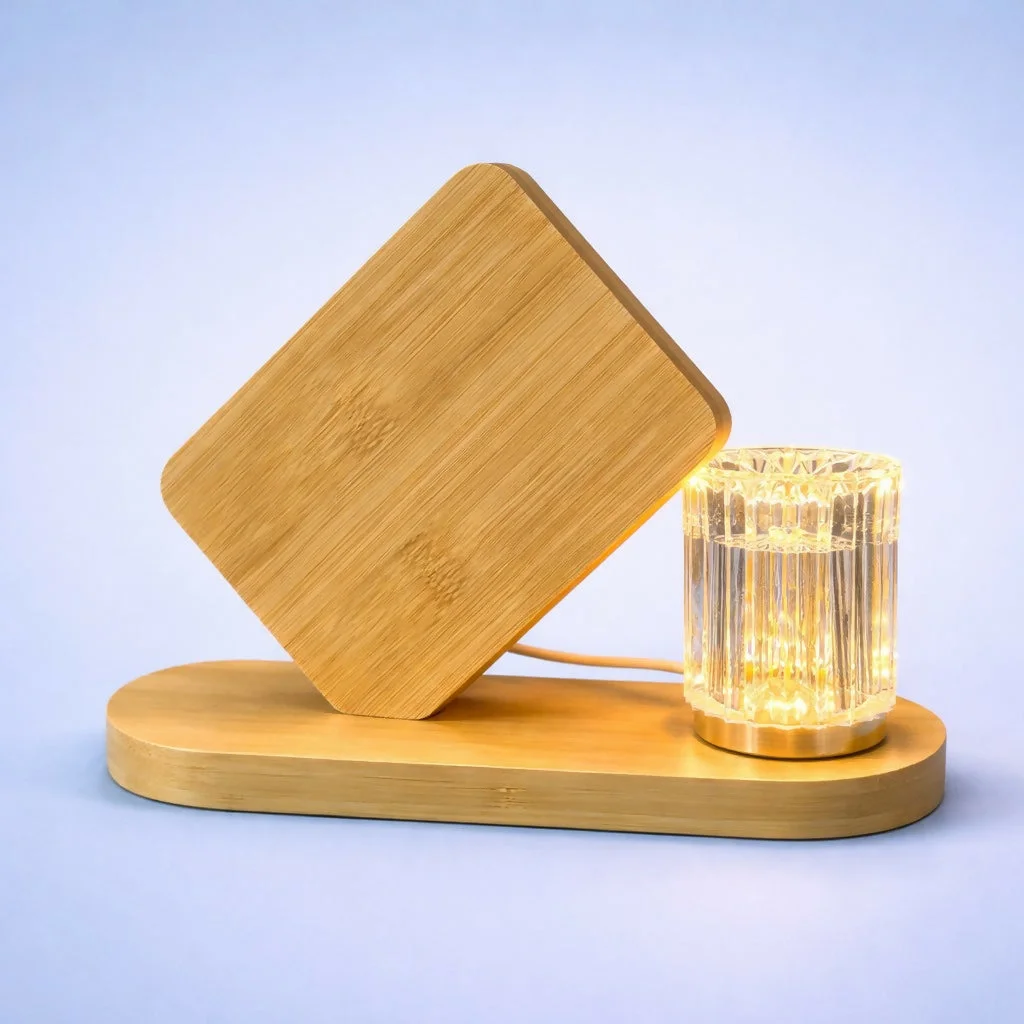 Enhance your space with this elegant wooden LED photo frame lamp, designed to combine memories with warm ambient lighting. The sleek wooden base holds a stylish tilted frame along with a crystal-style lamp that emits a soft, cozy glow. Perfect for bedside tables, desks, or gifting, this decor piece creates a soothing atmosphere while showcasing your favorite photo in a modern and aesthetic way.
