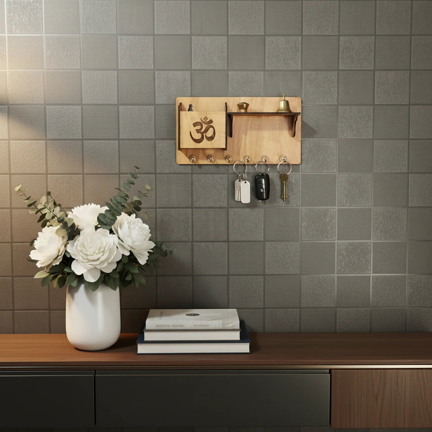 Made from high-quality engineered wood with a natural wood-grain finish, this key holder includes 6 sturdy metal hooks to neatly organize house keys, car keys, office keys, and keychains. The top shelf provides space for décor items such as idols, monk figurines, small plants, or pooja accessories, while the integrated mobile holder slot keeps your smartphone safe, visible, and easily accessible.