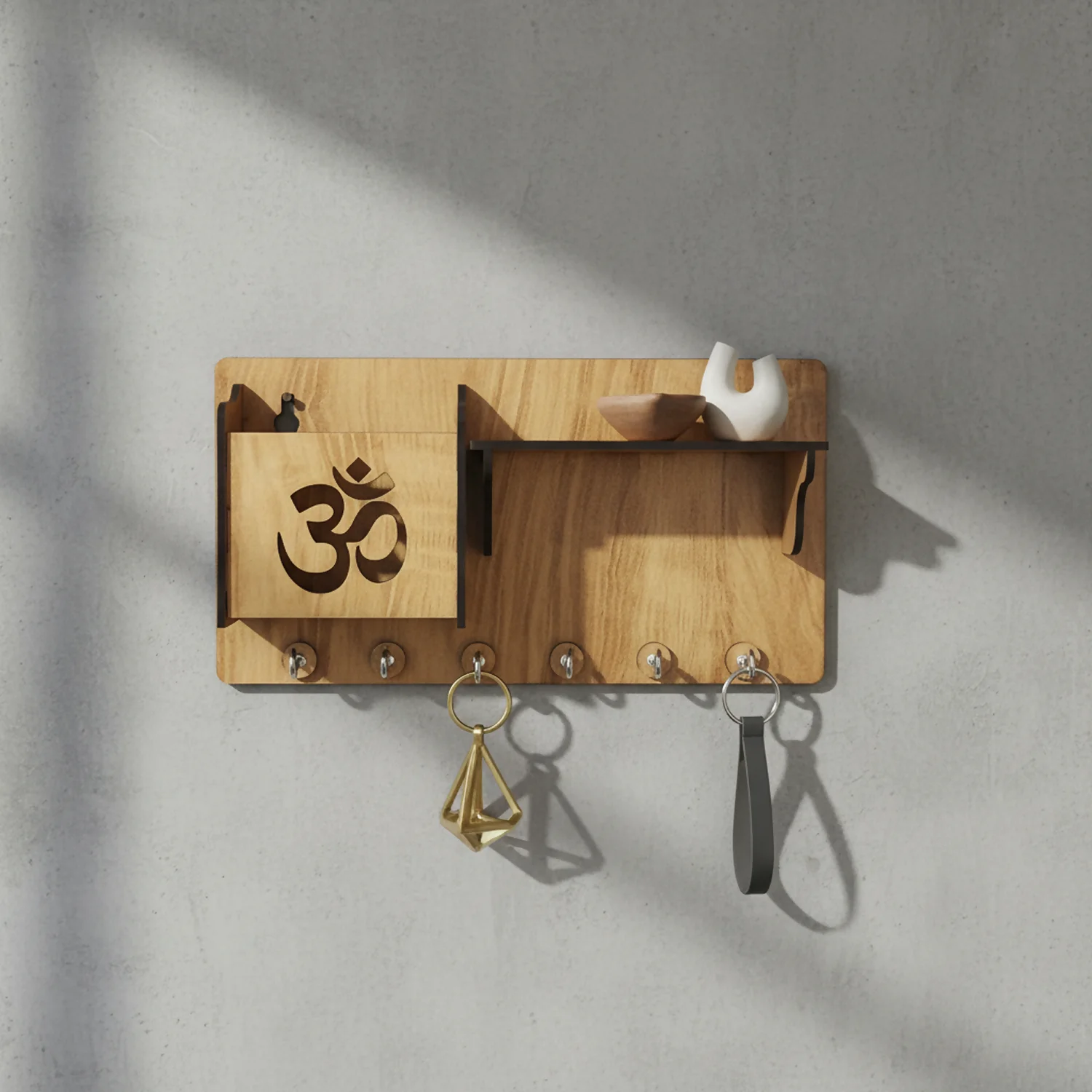 Bring together spiritual elegance and everyday organization with this beautifully crafted Wooden Om Key Holder with Shelf and Mobile Stand. Designed for modern Indian homes, this wall-mounted key holder features a laser-cut Om symbol, symbolizing positivity and calm, while offering smart storage for daily essentials.