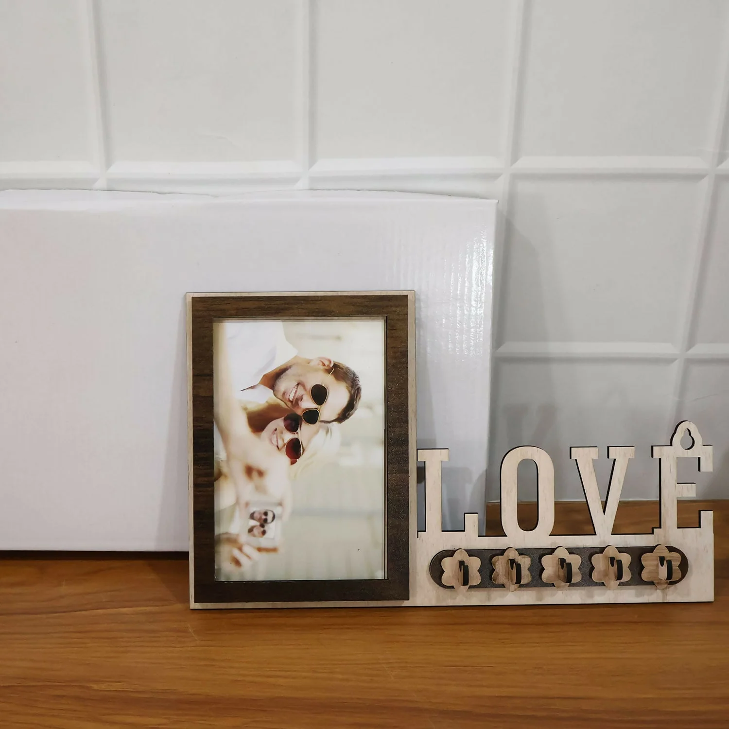 Be the first to review Wooden Photo Frame Key Holder with LOVE Cutout & 5 Hooks – 8 x 12 Inch!