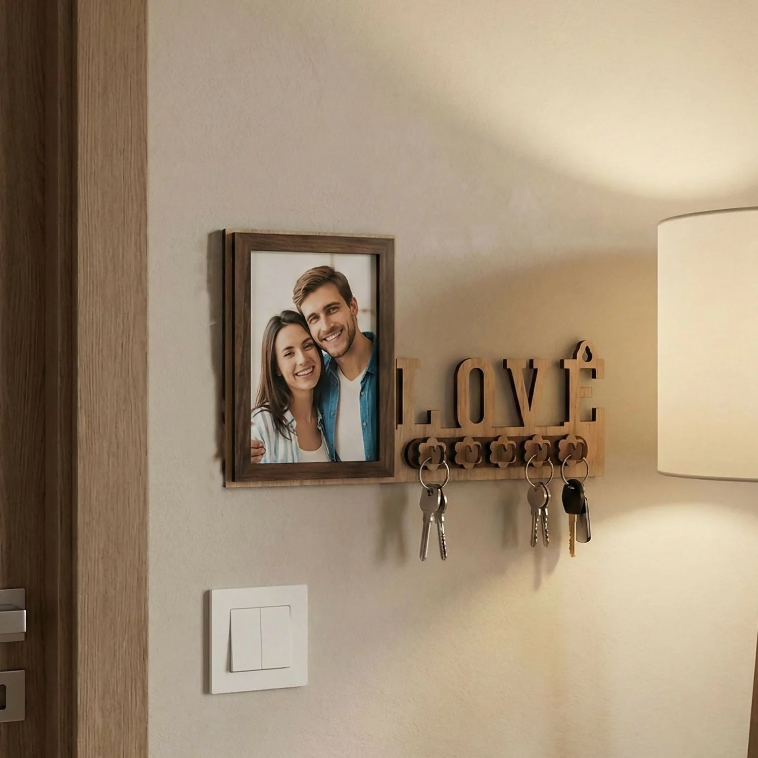 This wooden photo frame key holder combines a photo display and key organizer in one compact wall-mounted design. It features a vertical photo frame with easy photo insertion and a decorative “LOVE” cutout section fitted with five hooks for hanging keys or keychains. The layout helps keep daily essentials organized while adding a simple decorative touch to the wall. Suitable for entryways, bedrooms, or living areas, it is designed for regular indoor use. The compact 8 × 12 inch size makes it easy to place without taking up much wall space.