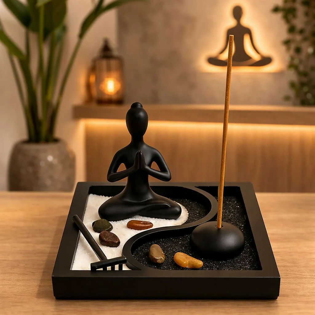 Create a peaceful and calming environment with this elegant Zen meditation garden décor set. Featuring a minimalist meditating figure, decorative sand tray, stones, rake tool, and incense holder, this set is designed to bring relaxation and balance to your space. The artistic layout with contrasting sand sections adds a modern touch while helping create a tranquil atmosphere for meditation, yoga, or quiet moments. Perfect for home décor, office desks, or meditation corners, this Zen garden set also makes a thoughtful gift for housewarmings, festivals, and spiritual décor lovers.